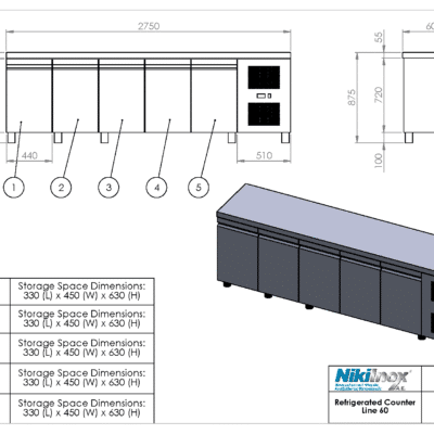 Ψυγείο πάγκος συντήρησης βάθος 60εκ. με 5 πόρτες Gastronorm PA-60-275M, ενσωματωμένο ψυκτικό μηχάνημα Niki Inox