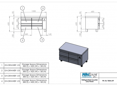 Ψυγειο πάγκος χαμηλού ύψους συντήρησης με 4 πόρτες GN 1/1, P-XA-224M με ενσωματωμένο ψυκτικό μηχάνημα Niki Inox