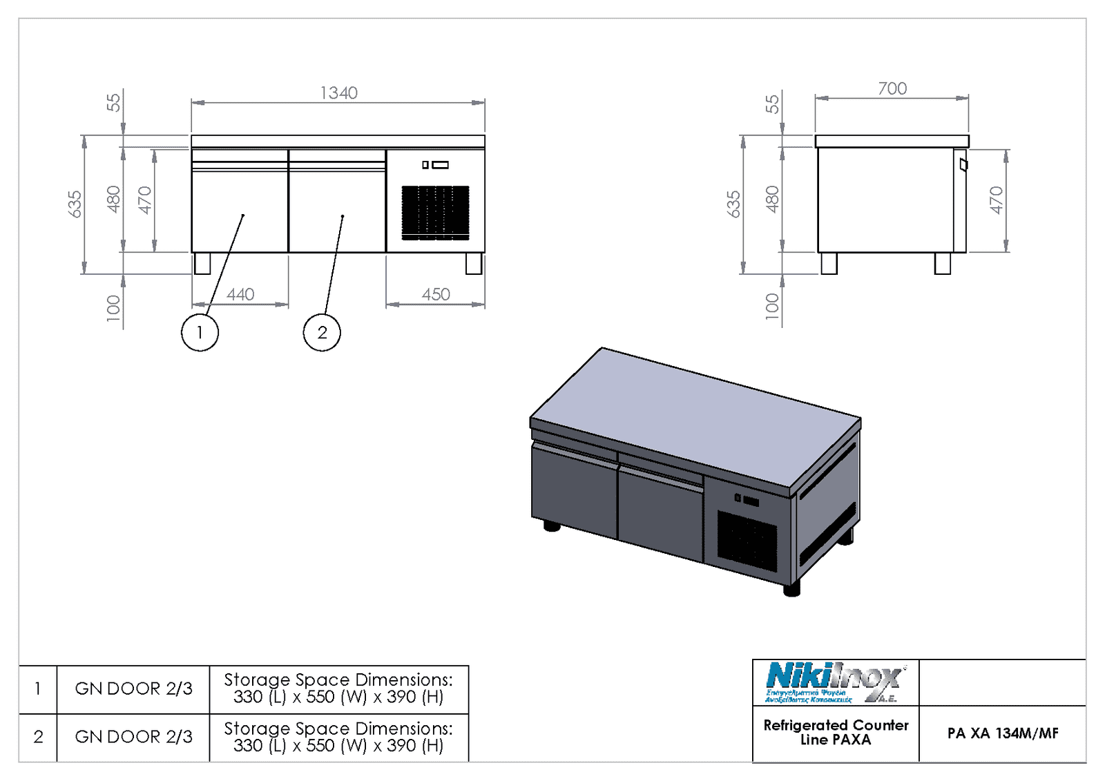 Ψυγειο πάγκος χαμηλού ύψους κατάψυξης με 2 πόρτες GN 1/1, P-XA-134MF με ενσωματωμένο ψυκτικό μηχάνημα Niki Inox