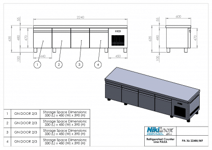 Ψυγειο πάγκος χαμηλού ύψους κατάψυξης βάθους 60εκ. με 4 πόρτες GN 2/3, P-X6-224MF με ενσωματωμένο ψυκτικό μηχάνημα Niki Inox
