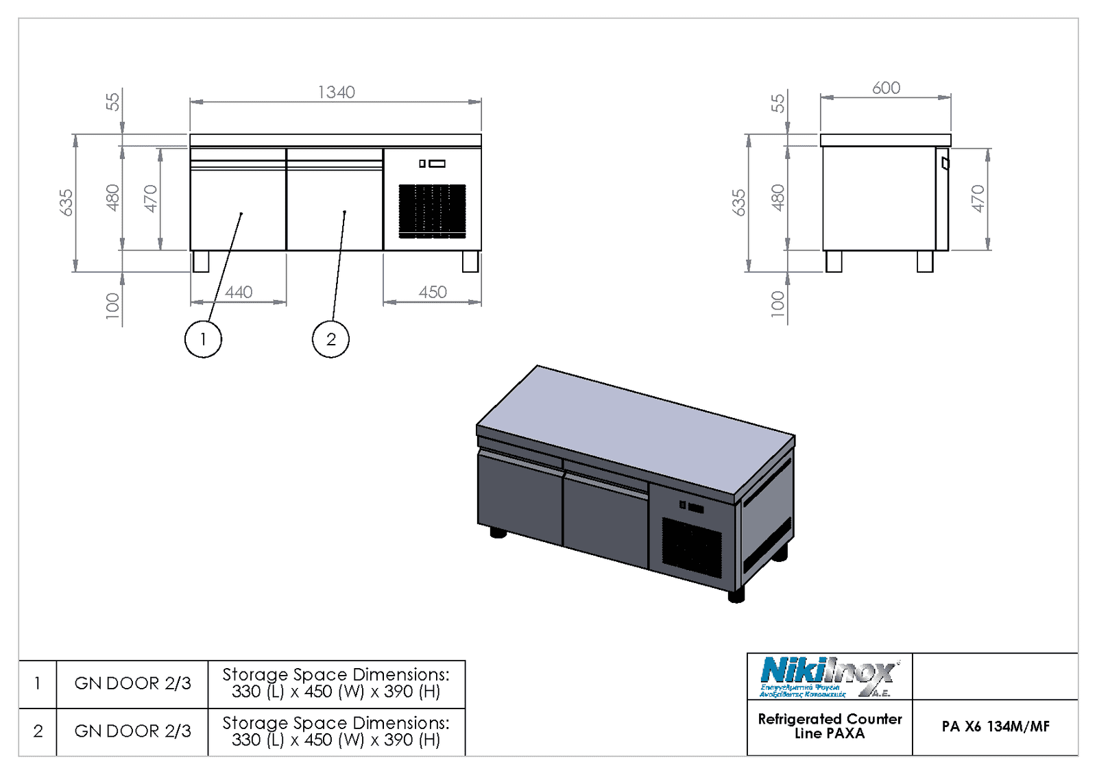 Ψυγειο πάγκος χαμηλού ύψους συντήρησης βάθους 60εκ. με 2 πόρτες GN 2/3, P-X6-134M με ενσωματωμένο ψυκτικό μηχάνημα Niki Inox