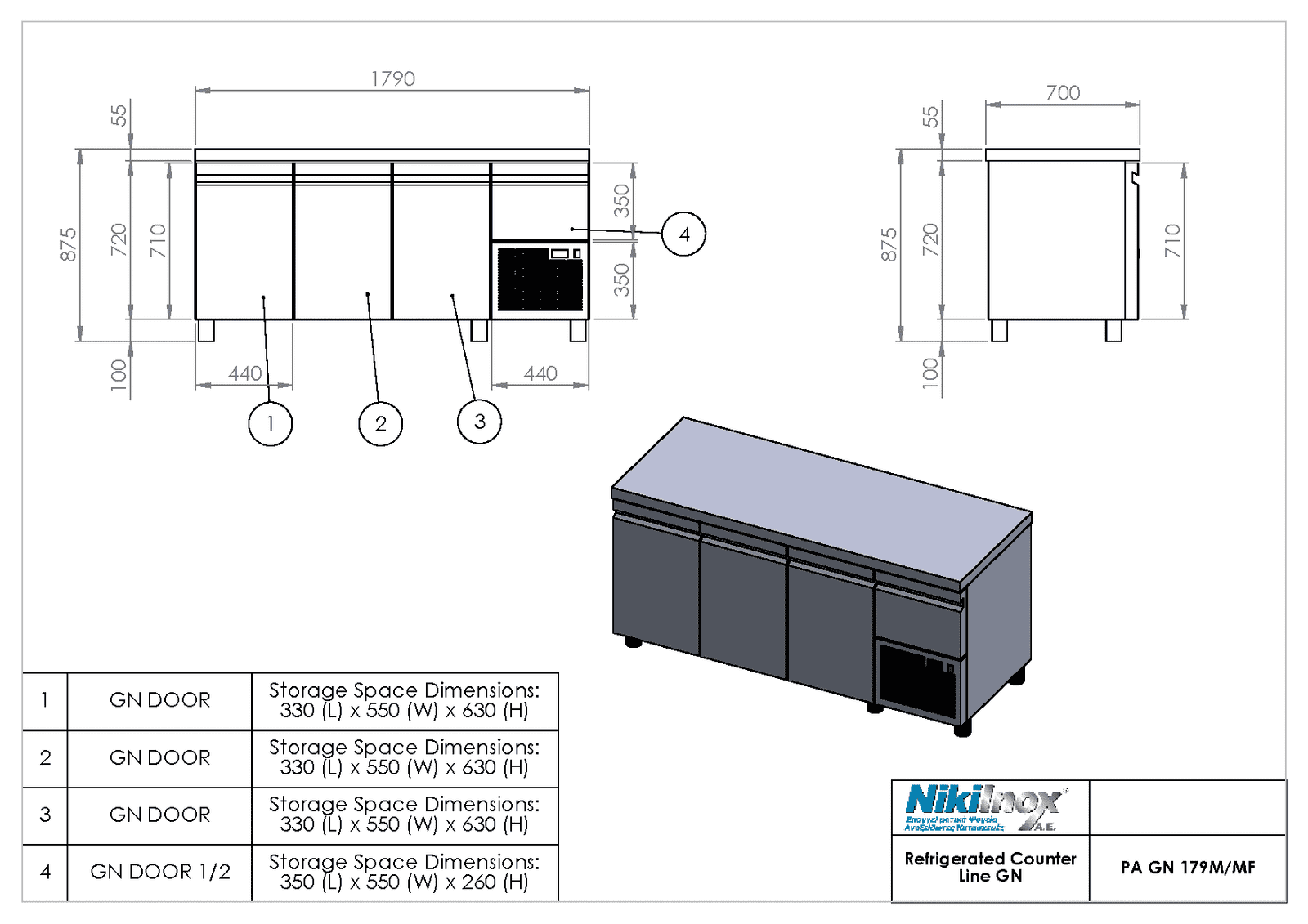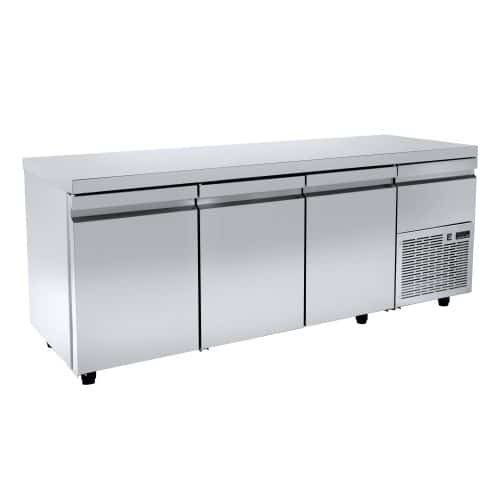 Ψυγείο πάγκος συντήρησης με 3 πόρτες Gastronorm και ψυχώμενη πόρτα επάνω από την μηχανή PA-GN-179M, ενσωματωμένο ψυκτικό μηχάνημα Niki Inox