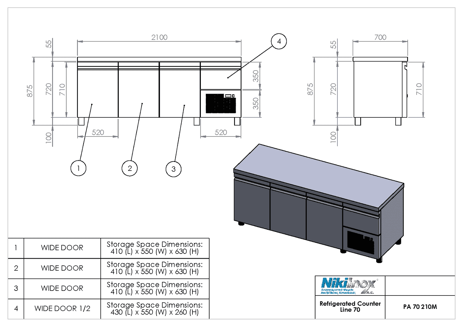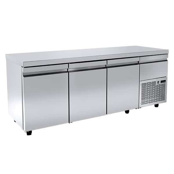 Ψυγείο πάγκος συντήρησης βάθος 70εκ. με 3 μεγάλες πόρτες και ψυχώμενη πόρτα επάνω από την μηχανή PA-70-210M, ενσωματωμένο ψυκτικό μηχάνημα Niki Inox