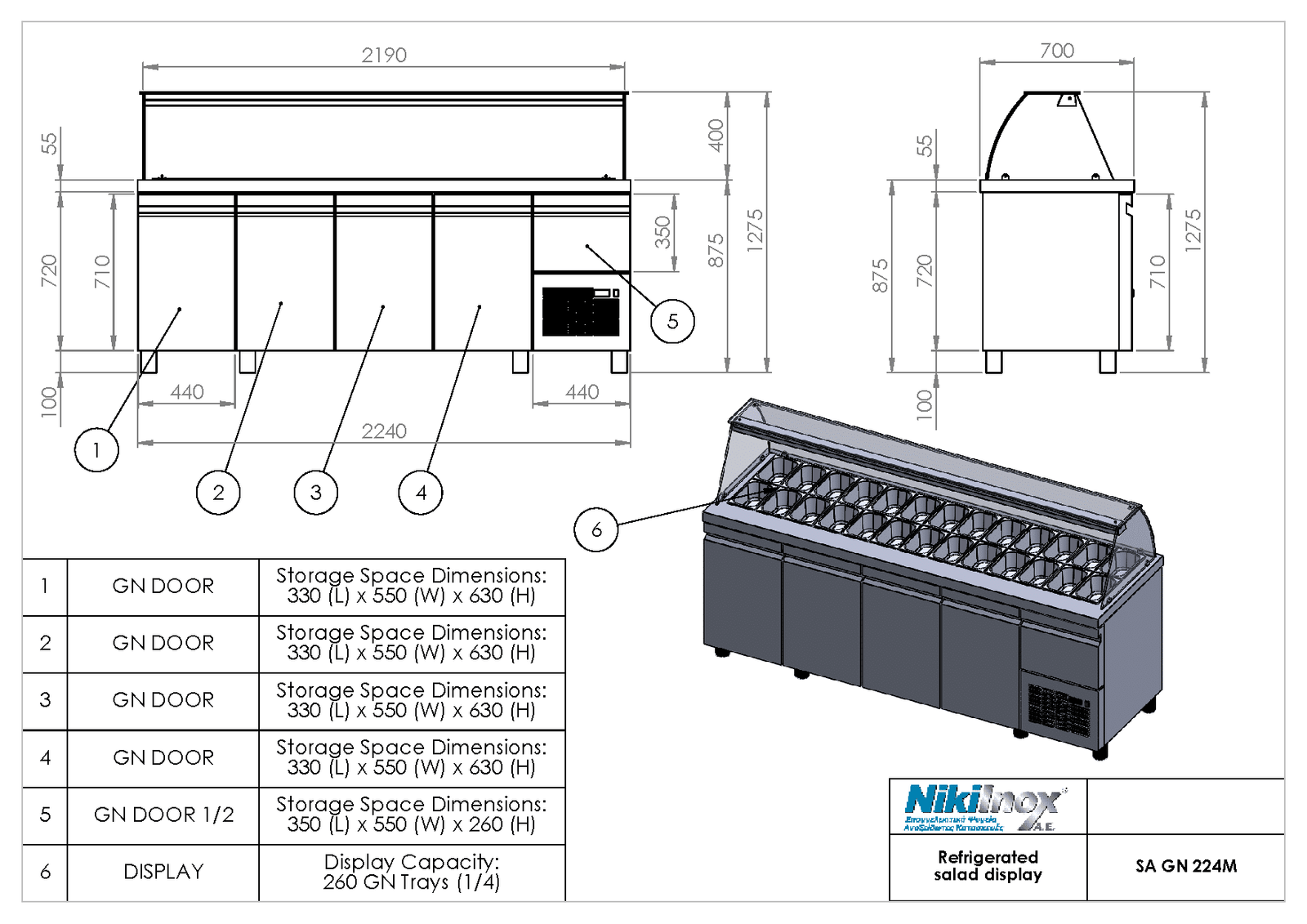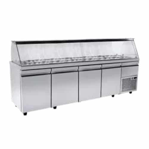 Ψυγείο βιτρίνα σαλατών με στατική ψύξη στην βιτρίνα,μήκους 224 εκ. SA-GN-224M με ενσωματωμένο ψυκτικό μηχάνημα Niki Inox